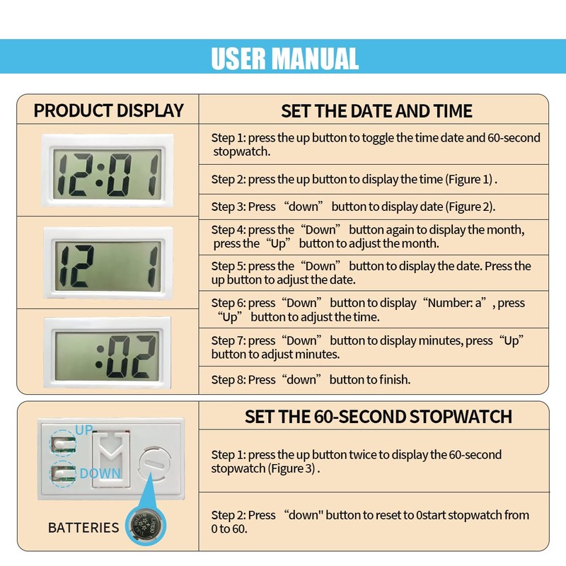 - 【Easy Setup】:There are only two small buttons on the back of this mini clock for adjustments. The UP button is a toggle button to switch what needs to be adjusted (hours, minutes, etc.) and the DOWN is an adjustment button. Press DOWN several times until "hours and minutes" are displayed. Then press UP to set the hour. Press DOWN once more to display the minutes, press UP to set, and then press DOWN to complete the procedure. and it's easy to change the batteries.