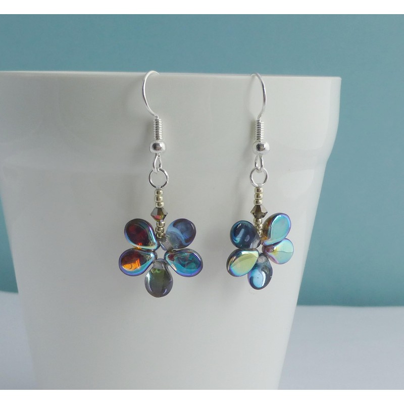 Small Funky Flower Earrings (Blue/Dark Silver Rainbow, sterling-silver)
