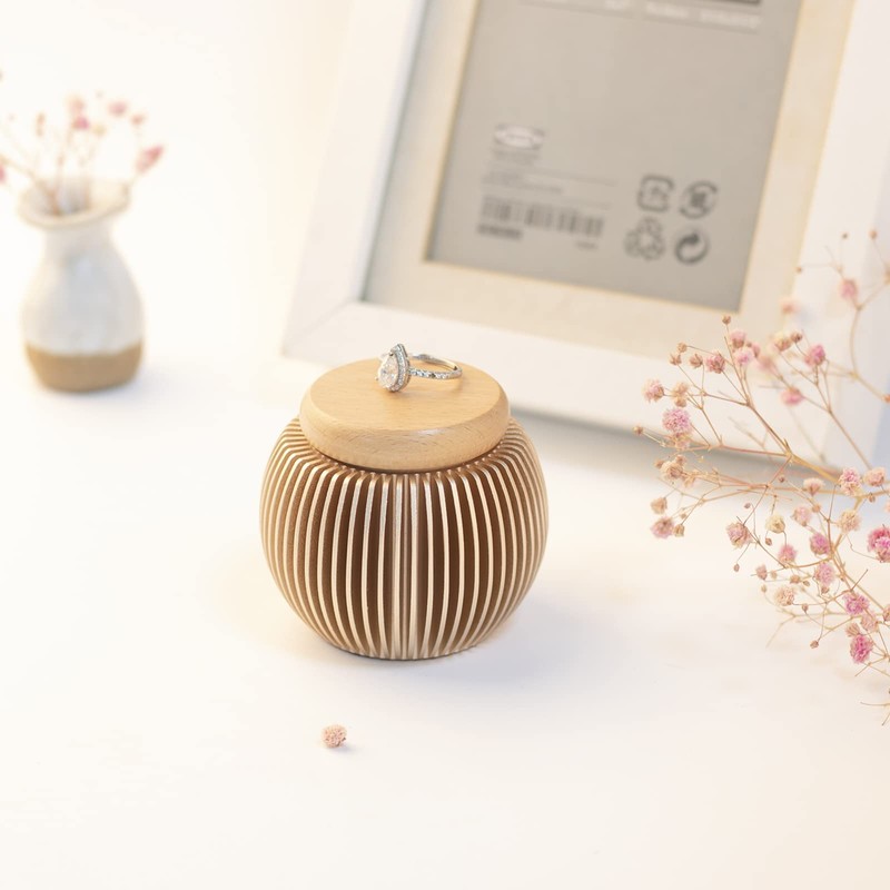 - (Good size to wrap with both hands) Urn Size: Outer dimensions: Diameter 2.6 x Height 2.2 inches (6.6 x 5.7 cm); Effective interior storage dimensions: Diameter 1.6 x Height 1.4 inches (4.1 x 3.5 cm); Material: Aluminum + Solid natural wood beech wood. We focus on the round design that makes you feel good when you hug it. Keep your hair and ashes of your loved ones and pet's hair in a place where you can always wear your hands close to your heart