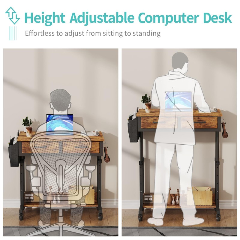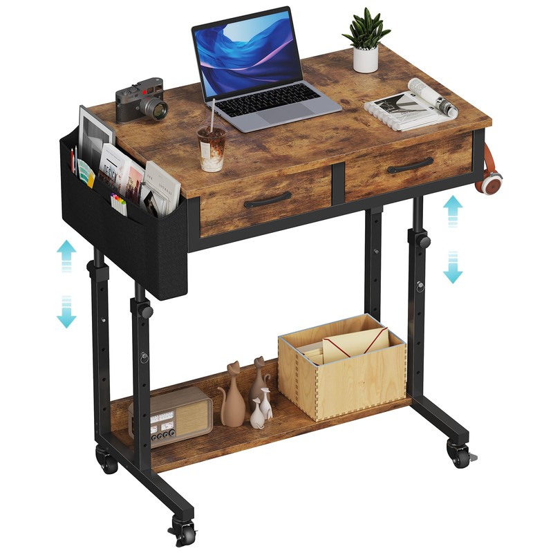 Small Portable Rolling Standing Desk - 32 Inch Adjustable Mobile Stand Up Teacher Desks with 2 Fabric Drawers on Wheels for Classroom, Couch Sofa Side Laptop Table with Storage for Home Office, Black