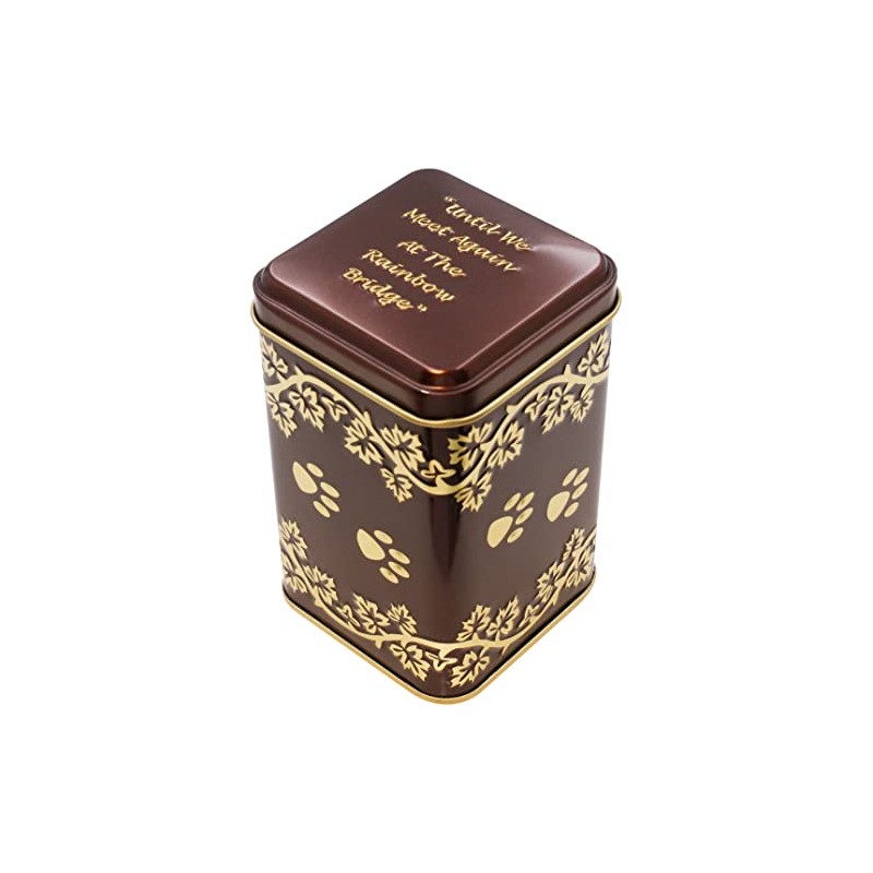 - A BEAUTIFUL MEMORIAL FOR YOUR BELOVED PET: This stylish urn tin is made from rolled steel with a bronze color finish and repeating raised bright bronze paw prints and oak leaf patterns. The top reads "Until We Meet Again at The Rainbow Bridge." See the description for the full Rainbow Bridge story.