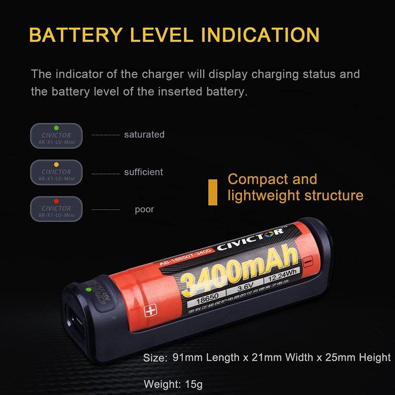 - Dual switch (tail and side) to adjust the 6 levels brightness (SOS, Strobe, 900lumen, 200lm, 30lm, 4lm). the longest run time up to 480 hours with CIVICTOR 3400mah 18650 battery(not included), also can powered by 2 pcs CR123A / 16340 (not included)