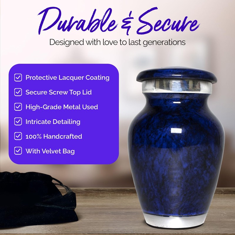 - High quality & durable keepsake urn for ashes: This beautiful purple small urn for human ashes is solid and made of high-quality metal with a shiny finish. The intricate small marble urn design is handmade by highly skilled craftsmen using traditional, time-honored techniques. Rest assured, this exquisite mini cremation urn will serve as a poignant symbol of remembrance for your loved ones.
