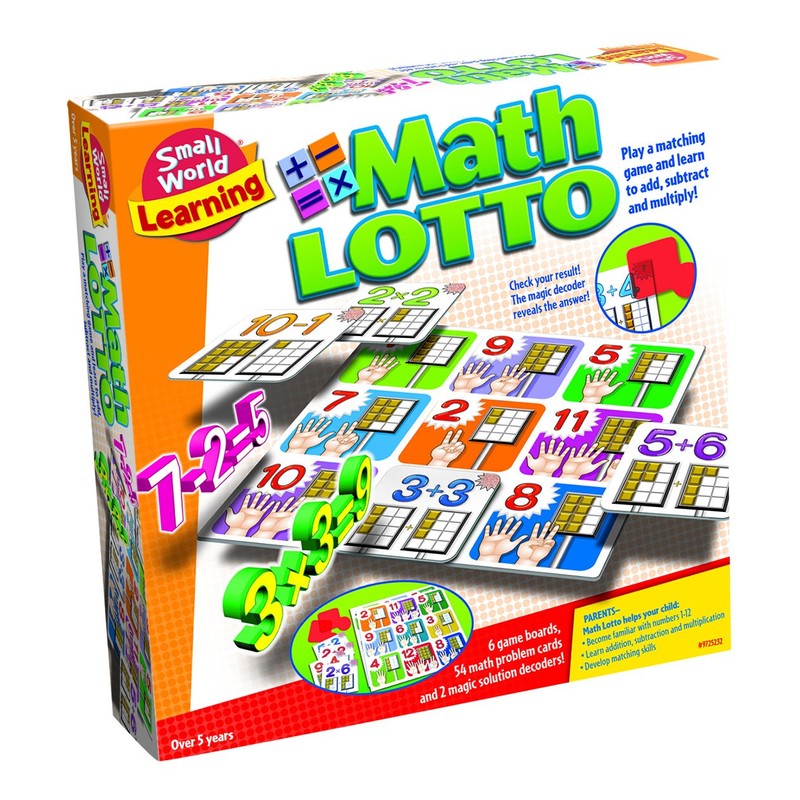 Math Lotto from Small World Toys is like 2 games in 1. Play the fun matching game and sharpen your math skills at the same time. The game helps children learn to add, subtract and multiply. There's even a secret decoder included in the box, so they can check their answers. Educational, challenging and fun for 2 - 6 players age 5 and up. The Small World Toys Learning collection is designed to build skills children will use for a lifetime. Unique games teach children about colors, match, shapes, sorting and more -- and all while they're having fun. Small World Toys has been a leading toy manufacturer for 50 years. We believe that play is an integral and necessary part of a child's development and education. At Small World Toys, we are committed to developing fun, innovative, high quality products for children of all ages.