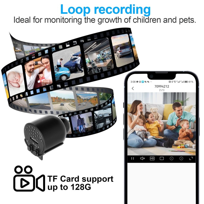 - ✔️【Never Stop Recording】— Mini Cam camera also supports loop recording without the problem of memory hogging. When the memory card is full, the latest files will overwrite the oldest ones. You will never miss the important things you want to know. You can use it to record the growth of your pets and children.