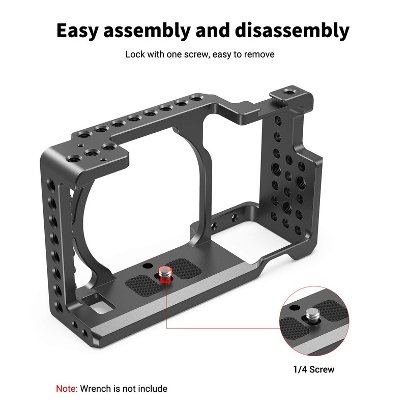 SmallRig DSLR Camera Cage 1661 for Sony A6000 / A6300 / ILCE-6000 / ILCE-6300 is a custom fit aluminum exoskeleton that protects your camera and provides mounting options to attach additional accessories. With the camera in the cage, you still have access to the SD card slot, battery compartment and all camera controls.