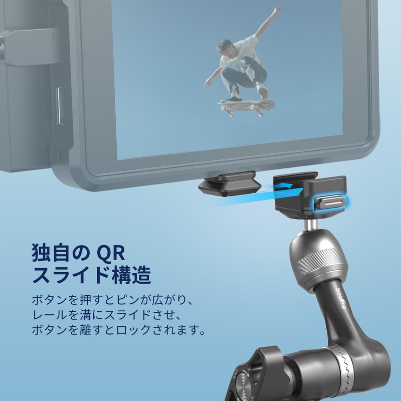 - 【クイックリリース構造】このマジックアームは、独自のクイックリリーススライダースロット構造を備えています。ボタンを1回押して、スライドを溝にスムーズにスライドさせるだけで取り付けが完了し、安定性と安全性が確保され、分解と組み立ての効率が向上します。