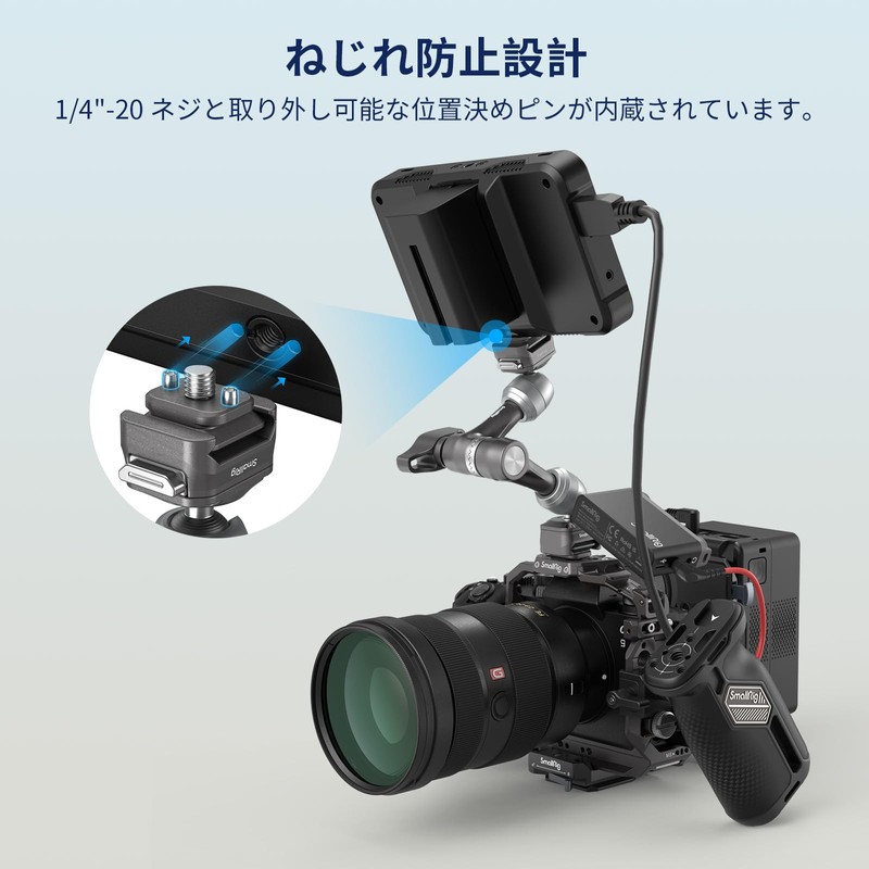 - 【ねじれ防止設計】トッププレートには 1/4 インチ - 20 ネジと位置決めピンが装備されており、モニター、LED ライト、4119B や 4088B などの SmallRig アクション カメラ ケージへの外部接続が可能です。この設定により、機器のたわみを効果的に防止し、撮影の安全性を確保します。