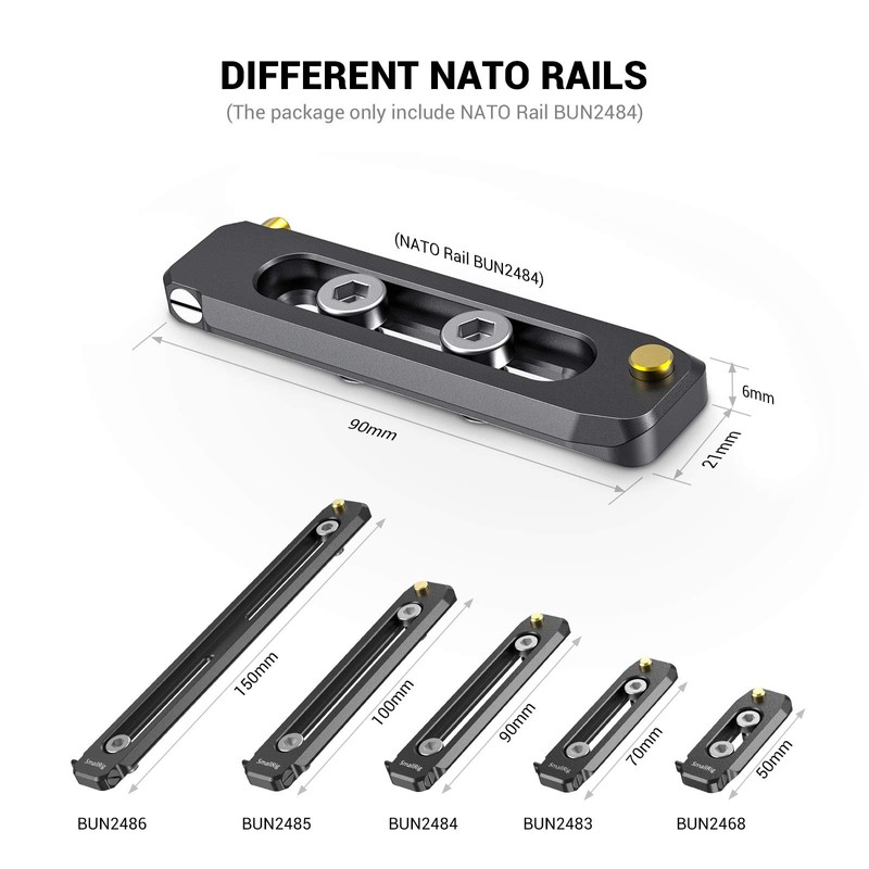 - Other NATO rails: If you prefer other NATO rail length options, we have SMALLRIG NATO rail BUN2468 (50 mm), NATO rail BUN2483 (70 mm), NATO rail BUN2485 (100 mm), NATO rail BUN2486 (150 mm)