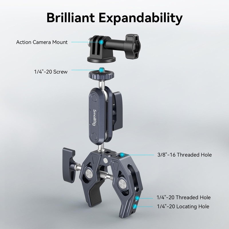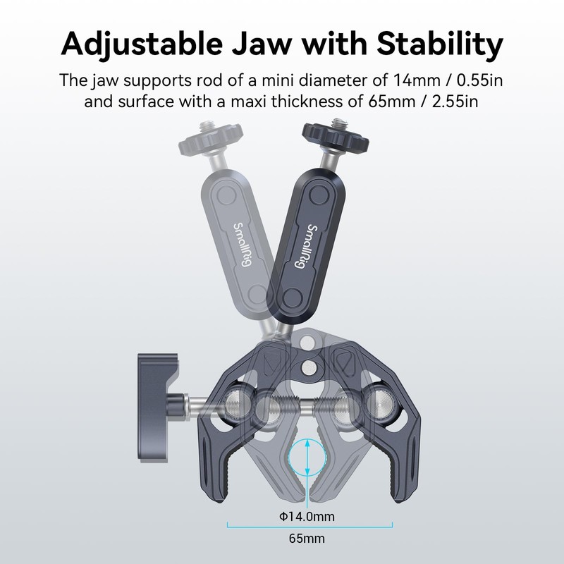 SmallRig Crab-Shaped Clamp with Ballhead Magic Arm 3757B is made of aircraft-grade aluminum alloy and stainless steel, CNC machined and carved to increase sturdiness and durability. It features skeletal design and shark clamp with stronger clamping force as well as widely compatible 1/4"-20 threaded holes, 3/8"-16 threaded holes. The clamp, which supports rod of a minimum diameter of 14mm and surface with a maximum thickness of 65mm, can quickly attach cameras, monitors, LED lights, etc. to round pipes, tables, handlebars, tripods and stabilizer handheld rings. In addition, built-in cushions provide protection and clamping stability. The ballhead magic arm consists of two ball heads and a ballhead clamp. An anti-twist design secures it to the crab-shaped clamp to prevent disconnection. The bottom ballhead is designed with a hex hole for enhanced fastening with the Allen wrench. The 360-degree adjustable ball heads feature anti-slip threads for easier locking and one 1/4"-20 screw to allow quickly connecting action cameras, monitors, LED lights, microphones, and other accessories.