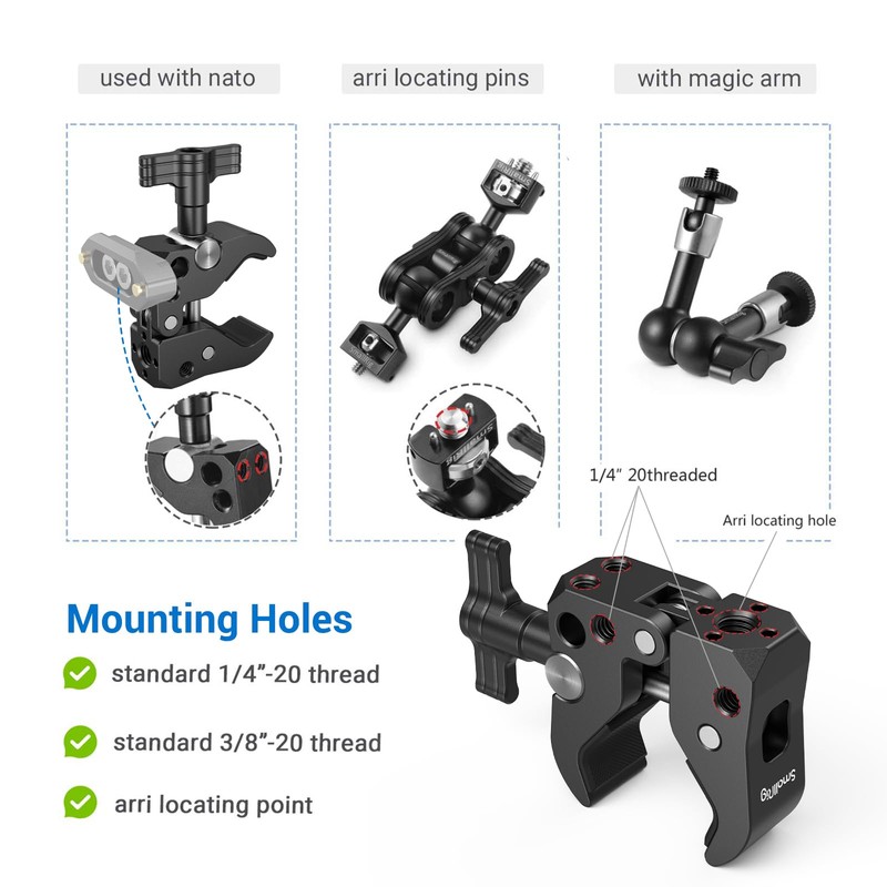 - Mounting points: the super clamp has four 1/4 threaded holes and a 3/8 threaded holes according to ARRI standard. With the threaded holes, you can connect a variety of accessories according to your requirements, such as SMALLRIG Magic Arm 2115, SMALLRIG Magic Arm 2070, SMALLRIG NATO Rail 1409, etc