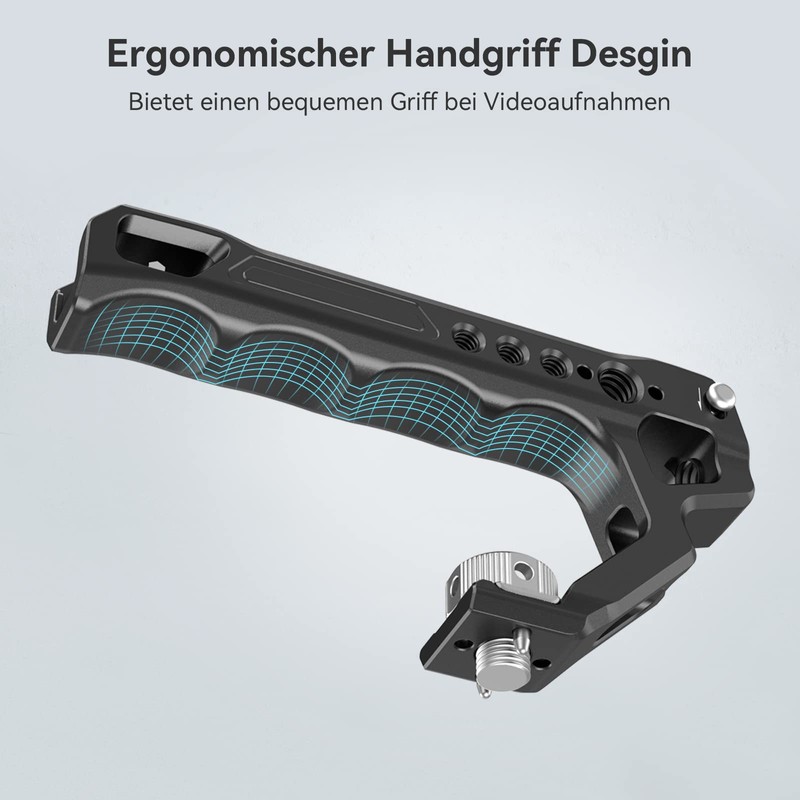 - ANTI-OFF COLD SHOE: On the top front of the handle there is a cold shoe for microphone, LED lights, monitor mounts and EVF mounts. In addition, the handle is equipped with an anti-off pin that prevents the cold shoe adapter from accidentally loosening. :