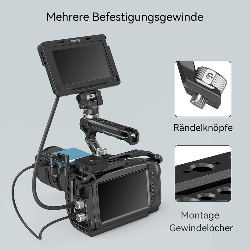 - Mounting points: the SMALLRIG camera handle with a wealth of 1/4 inch and 3/8 inch mounting points and a mounting hole for the ARRI standard for attaching accessories, such as B. SMALLRIG Magic Arm 2065 and 2070.