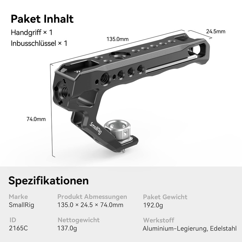 - Top handle: This SMALLRIG Top Handle 2165 has been developed for hand shots and can easily hold the weight of a large cage rig with different attachments.