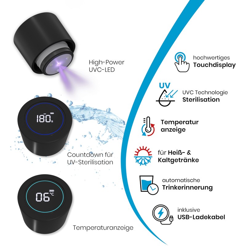 - Innovative UV-C LED sterilisation: at the touch of a button, you always have safe, clean drinking water at hand. The UV-C LED technology in the lid of the water bottle sterilises water and bottle up to 99%.