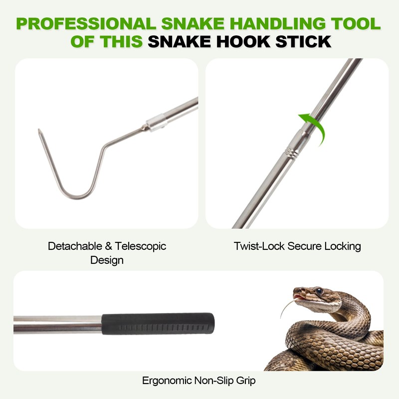 Our company specializes in the production of snake grabber tool, snake hook, snake tongs, snake stick, snake stickers, snake tongs grabber, snake sticks and grabbers, snake grabber tool heavy duty, snake hook heavy duty, snake tong, snake hooks and grabbers, snake hooks. Write out the product description, and require the product description to include the product snake grabber tool, snake hook, snake tongs, snake stick, snake stickers, snake tongs grabber, snake sticks and grabbers, snake grabber tool heavy duty, snake hook heavy duty, snake tong, snake hooks and grabbers, snake hooks The Smarkey Snake Hook is the ultimate tool for safely handling and relocating snakes, made with premium stainless steely. This versatile snake grabber tool is designed for snake enthusiasts, wildlife control professionals, and herpetologists, providing precise control and extra reach for safely capturing snakes. With an extensible length of 42 inches, this snake hook ensures that you can safely handle even the most dangerous snakes, including rattlesnakes, copperheads, ball pythons, cobras, and corn snakes, without coming into direct contact. Whether you are performing field expeditions, handling snakes in the wild, or dealing with reptiles at home, this snake tongs grabber gives you the ability to move and manage snakes efficiently and securely. The snake tongs design allows for smooth extension and retraction, making it convenient to store and transport. The sturdy snake hook heavy duty construction ensures that you can handle snakes of various sizes, from the smallest garter snakes to larger and more aggressive species like pythons and king snakes. With this snake grabber tool, your snake-handling experience will be safer, more efficient, and stress-free. Whether you're a professional or just a lover of reptiles, the snake sticks and grabbers from Smarkey are the perfect addition to your tool kit.