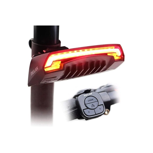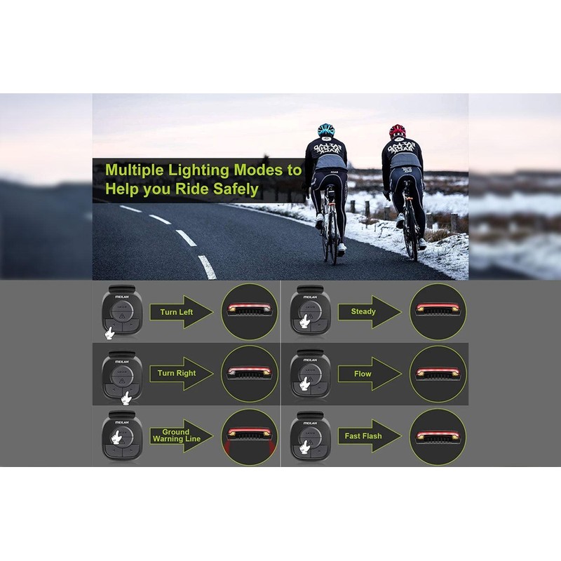 【WIRELESS REMOTE CONTROL】Installed it on the handlebar, easy to switch the lighting modes of the bike rear light by press the four buttons on the controller. Total six lighting modes: (Steady with full brightness/ Fast Flash/ Flowing Light/ Turn Left/ Turn Right/ Ground Line).