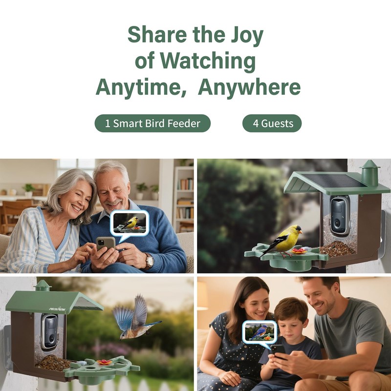 - Free Storage, Share with Family - This solar bird feeder comes with lifetime free cloud storage (7-day loop) and supports TF cards up to 128GB (not included). Connect up to 4 mobile phones, allowing family or friends to join in and share adorable bird moments on social media. The AI feature requires a paid subscription for a smarter bird-watching experience.