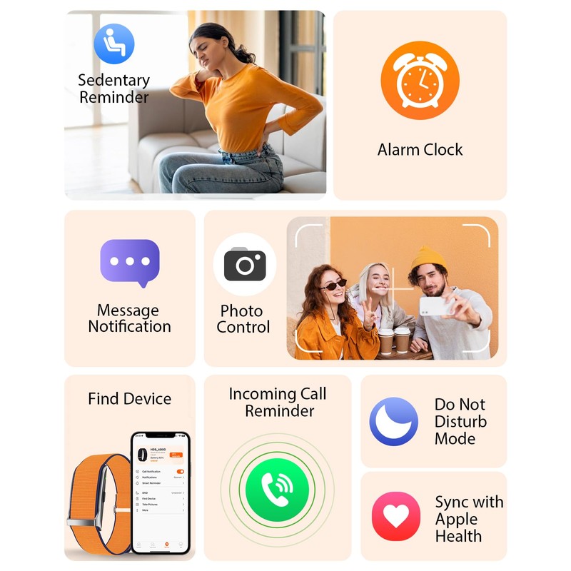 - 【Multiple Practical Functions】The fitness trackers with various smart features including vibration reminder for incoming calls and messages, female function, sedentary reminder, alarm clock, do-not-disturb mode, find device, photo control and can also sync with Apple Health, which makes it a better all-around way to take care of your health.