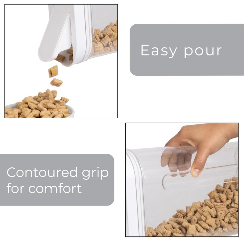 - Cereal container with contoured grip and pop-up lid for easy pour