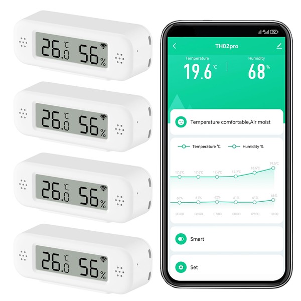 Smart Digital Thermometer Hygrometer, WiFi Indoor Temperature and Humidity Sensor with App Notifications, Mini Room Temperature Meter with Data Storage and Export, Compatible Alexa, 4 Pieces