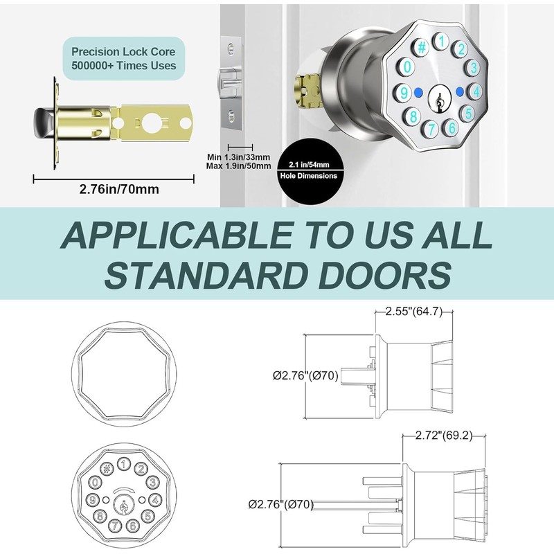 - [WIDE APPLICATION]:The keypad door lock is suitable for door thickness: 1-3/8'' to 2-1/8'' (35 to 55mm). Adjustable latch: 2-3/8 inches to 2-3/4 inches (60 to 70 mm).It is ideal for all US standard doors.Not need to distinguish between left and right. Free-pass mode can keep it unlocked at any time which is convenient for your family to enter and exit freely.Digital door lock is ideal.