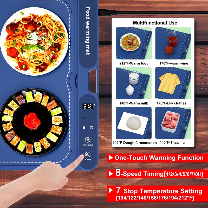 Smart Food Warming Mat One Click Intelligent Warming Function 8-Second Rapid Heating Heat Durable Nano Silicone Easy Clean Standard Size (Blue, 24''X15'')