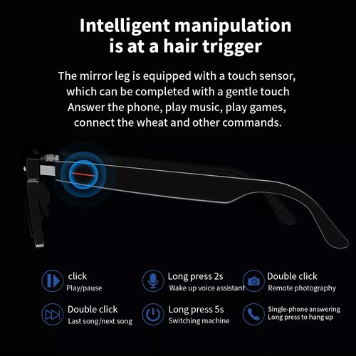 - Intelligent Manipulationis at a Hair Trigger: The glasses leg is equipped with a touch sensor,which can be completed with a gentle touch, Answer the phone, play music, play games,connect the wheat and other commands