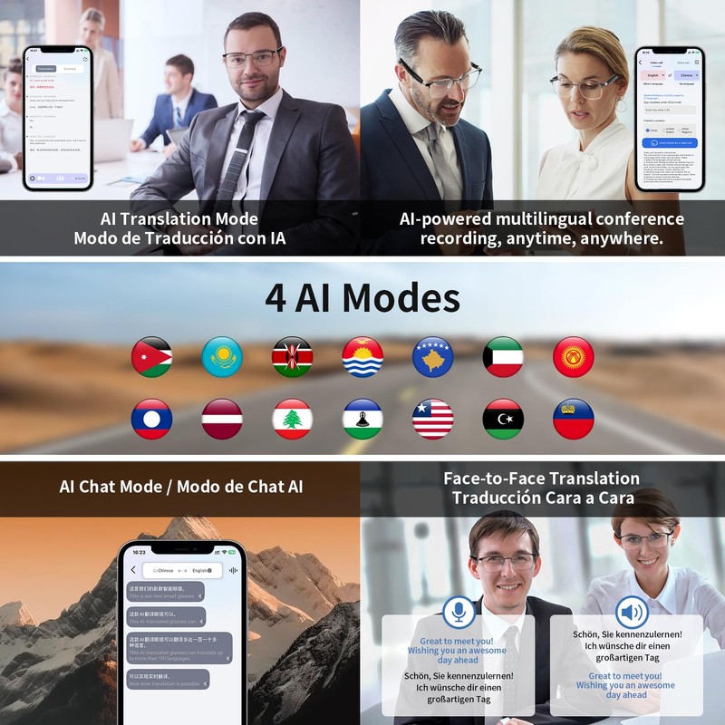 • 【Super strong translation system】 Smart translation glasses support automatic recognition and translation of 165+ languages, whether it is business negotiation or international travel, it can achieve seamless communication. With on-site recording, simultaneous interpretation and face-to-face translation functions, you can easily cope with any occasion.