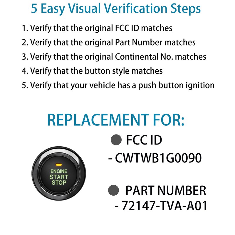 - 【Note】Pls check the compatibility, verify the Interchange Part Number:72147-TVA-A01, FCC ID: CWTWB1G0090 are the same as your original key before you order it. Make sure it has the same shape with your Honda Accord 2018-2021 original key. This is a non-OEM product, aftermarket accessory only! Package Included: 1 x Car Keyless Entry Remote (Battery included). Full satisfaction risk free purchase within 90 days. If the remote does not work out for any reason, simply contact us for a refund or replacement.