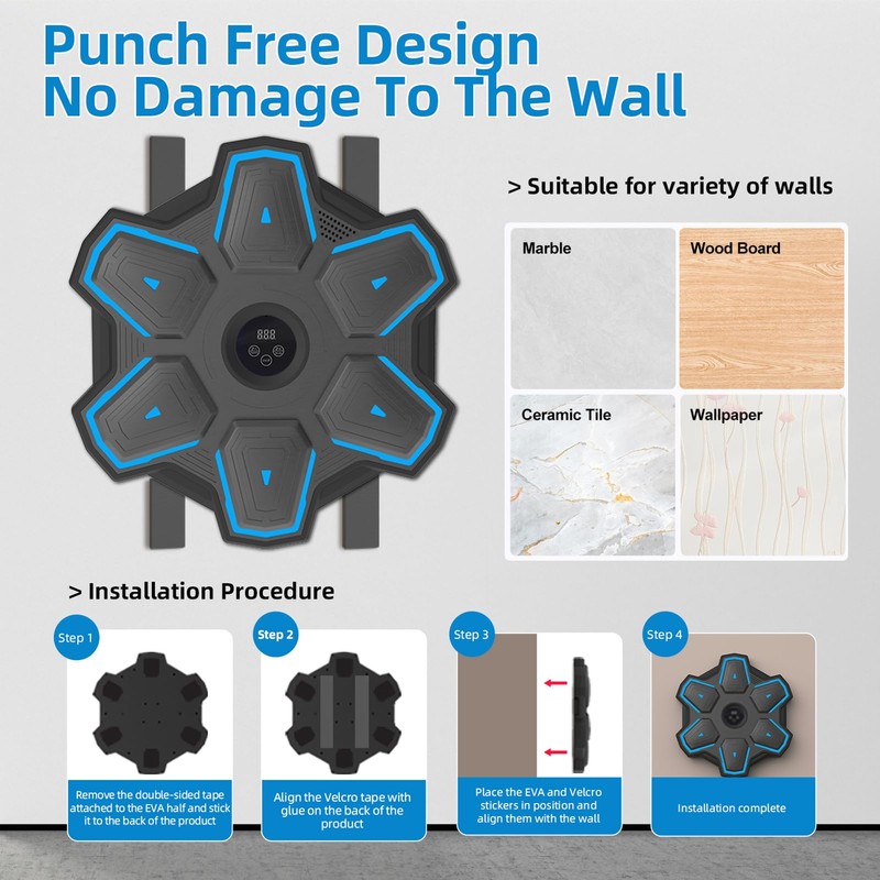 - 【Easy Installation & Space-Saving Design】This music boxing machine for adults is wall-mounted, saving space and offering the convenience of home workouts without the need for a gym. Installation is quick and simple with the included Velcro strips, which provide a secure and adjustable fit on any wall. Ideal for both indoor and outdoor use, you can enjoy your boxing machine wall-mounted music anywhere, anytime.