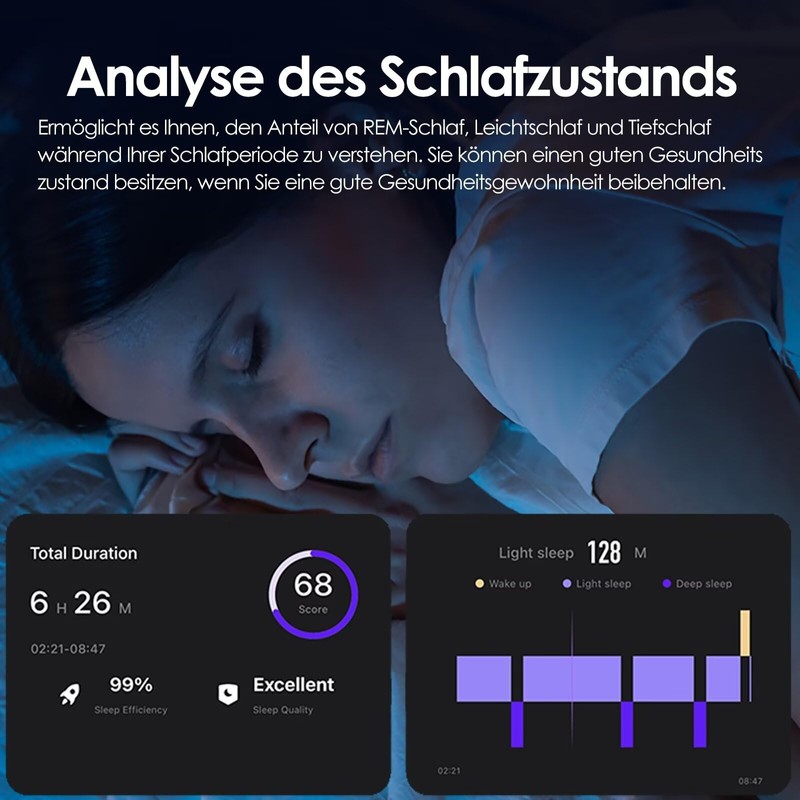 - Heart rate monitor in real time and sleep tracker: the fitness ring monitors your heart rate 24 hours a day (must be set up in the app) and can give you a better understanding of your heart rate changes. At the same time, the smart ring can monitor your sleep time at night and early morning, including wake up time deep sleep and light sleep, which can help you develop good sleeping habits. You can view all data monitored by the ring in the app.