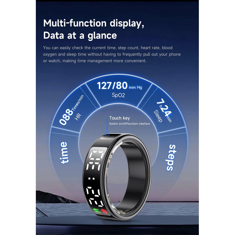 - SMART RING WITH DISPLAY: this smart ring has a screen to display time, blood oxygen, heart rate, sleep, battery, step, calls etc data. Advanced sensors monitor heart rate(24h continuous tracking), blood oxygen levels and sleep patterns for comprehensive health insights