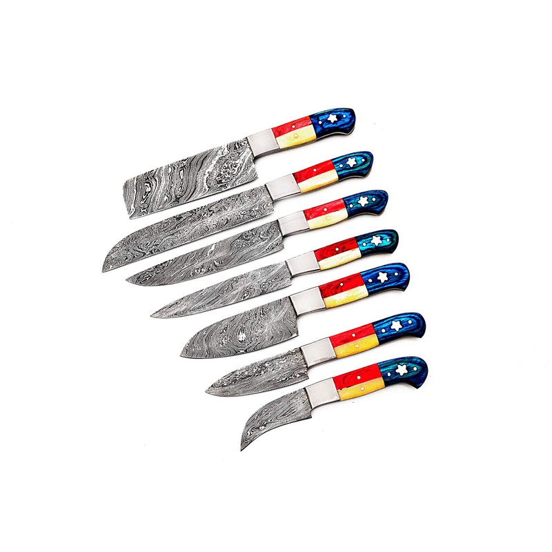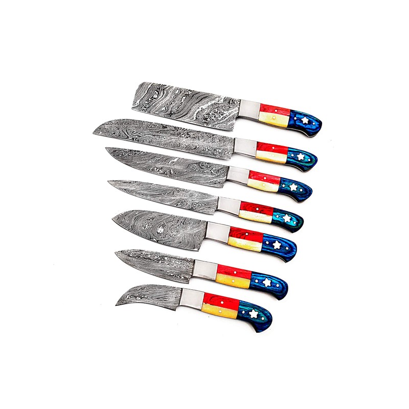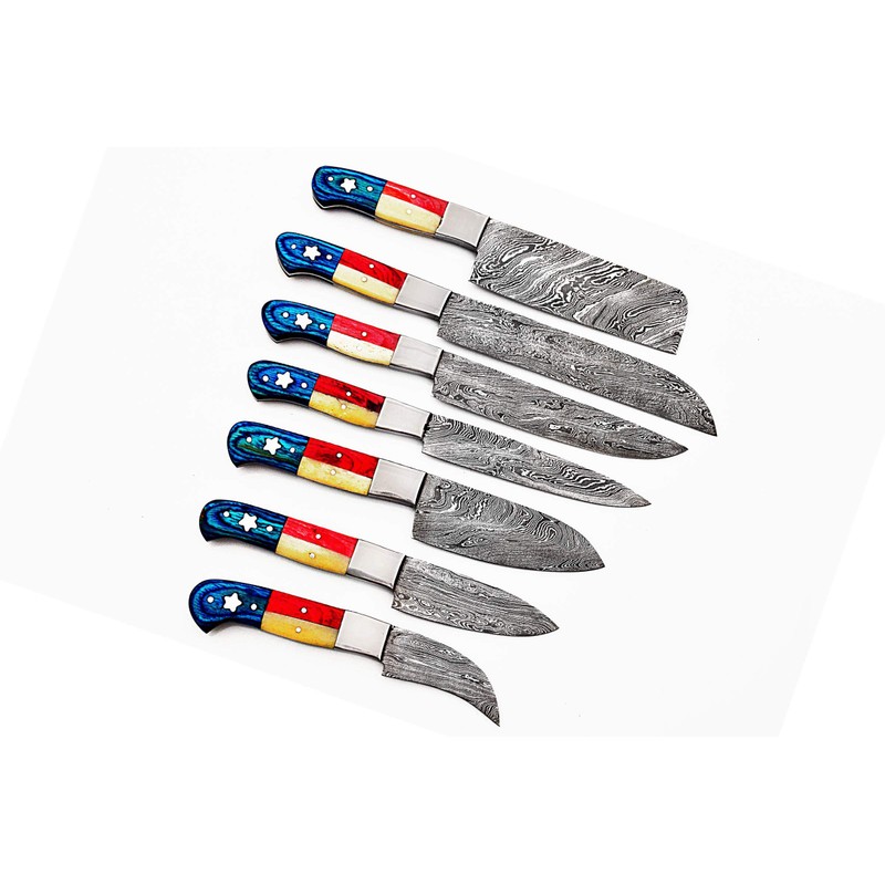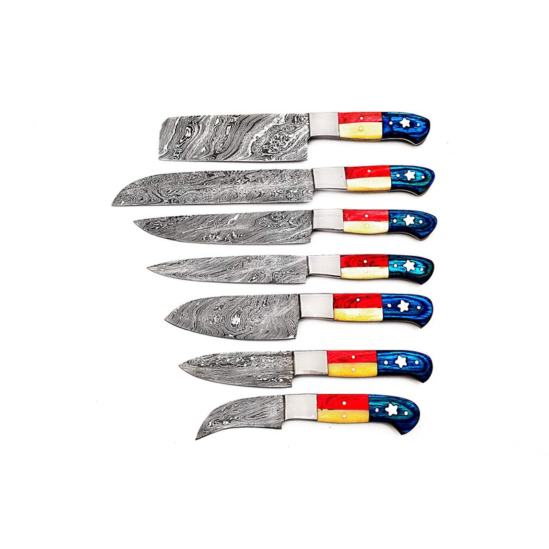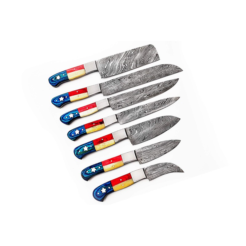 Smart & Sharp Custom Handmade Damascus Chef Knives Set/Kitchen Knives 7 Pieces Set SS-17309, (Red, Blue Wood and Bone)