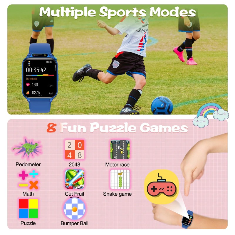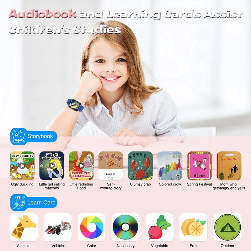 - 【Entertainment & Educational Learning function】The newest upgrade kids smart watch introduces the storybook(Storybooks available for free download each week), and learn card that traditional watches don't have.Cultivate a love of reading and encourage exploration of children's word and picture learning. And with playable various puzzle games to choose from kids(parent could restrict your child from playing games at school in the APP).The exclusive "Reward Coin" system allows children to earn virtual coins by completing specific tasks. These virtual coins can be used to redeem rewards, making life more fun.