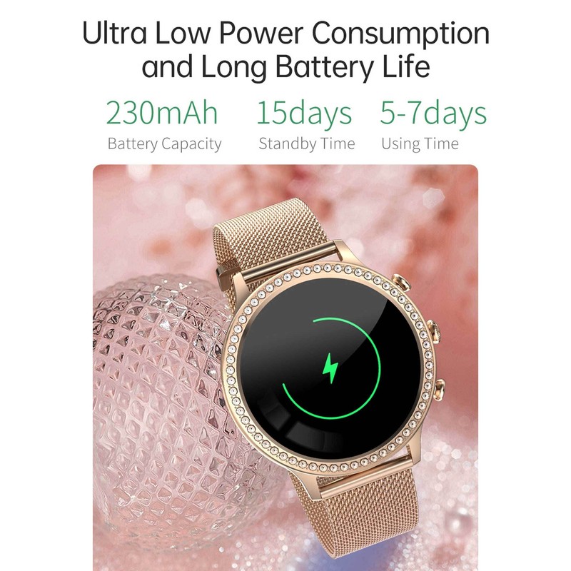 - 【Womens Stylish Smart Watch with 100+ Dials】Exquisite and beautiful appearance design,the frame of the watch is dotted with flash diamonds,which is more vivid and dazzling.Using 1.32-inch large full touch screen,the picture quality is more delicate and clear.100+ dials can be switched,you can also custom the watch face,match your different styles.