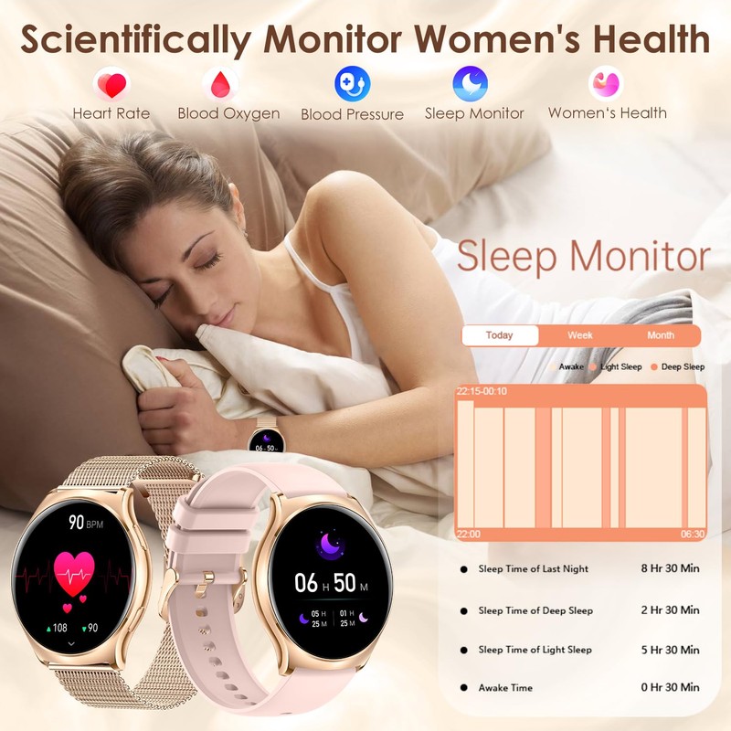 - 【Wrist Health Monitoring Watch】Womens watch uses optical sensors to monitor your daily blood pressure, blood oxygen, heart rate, sleep and pressure through scientific data, so that you always know your health condition. Ladies watch is equipped with women's health monitoring function, including physiological cycle, pregnancy cycle, etc., easy to manage your women's cycle problems, so that you can prepare for the date before it comes