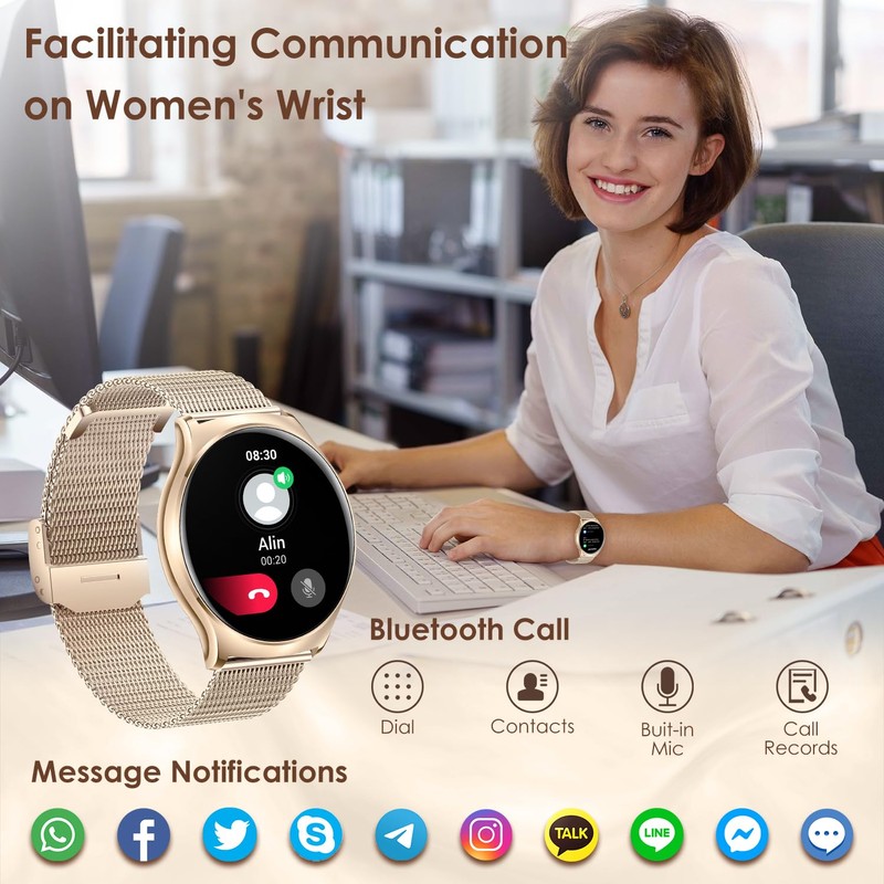 - 【Bluetooth Call & Smart Notifications】Women's smartwatch comes with a built-in microphone and speaker so you can make and receive calls clearly and stay connected at all times. Android smart watch has a built-in vibration device to alert you of the latest notifications from SMS, Facebook, Twitter, Whatsapp and more. When connected via Bluetooth, you can also use digital watch to set customized alarms to remind yourself to drink water, avoid being sedentary, etc. It also features an AI voice assistant