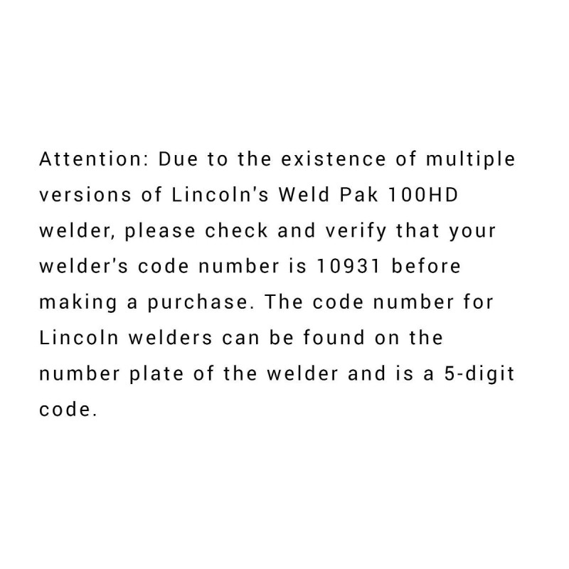 Attention: Due to the existence of multiple versions of Lincoln's Weld Pak 100HD welder, please check and verify that your welder's code number is 10931 before making a purchase. The code number for Lincoln welders can be found on the number plate of the welder and is a 5-digit code.