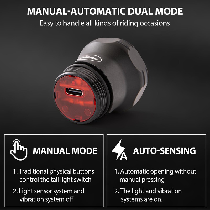 - Dual modes: manual and automatic. In manual mode, traditional physical buttons control the taillight's on/off, with light sensing and vibration sensing systems turned off. In automatic mode, the taillight turns on/off automatically without manual operation. The light sensing and vibration sensing systems are turned on and functioning.