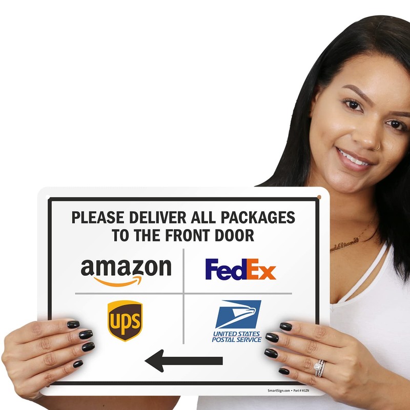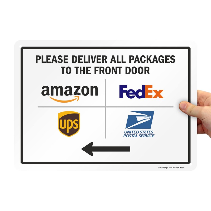 SmartSign 10 x 14 inch “Please Deliver All Packages to The Front Door” Metal Sign with Left Arrow and Logos, 40 mil Laminated Rustproof Aluminum, Multicolor
