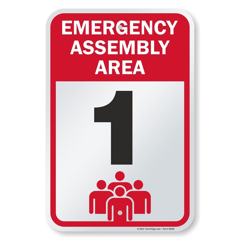 SmartSign 18 x 12 inch “Emergency Assembly Area 1” Metal Sign with Symbol, 63 mil Laminated Rustproof Aluminum, Red, Black and White, Made in USA