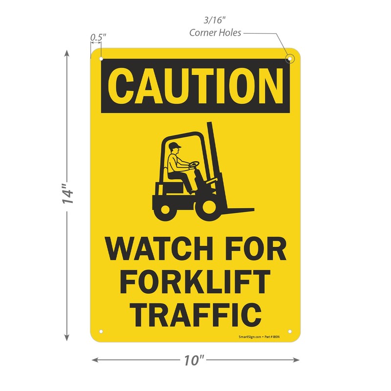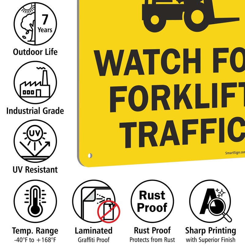 - DURABLE ALUMINUM: 'Watch For Forklift Traffic' signs are made from heavy-duty 40 mil thick aluminum. Unlike steel signs, our aluminum signs do not rust. Signs easily last up to 7 years outside.