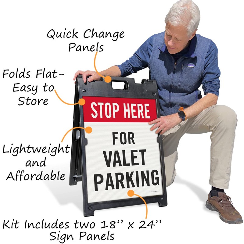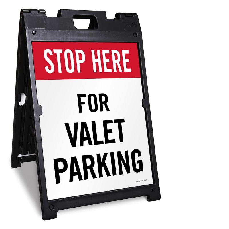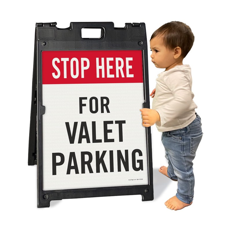 SmartSign 24 x 18 inch “Stop Here For Valet Parking” Two-Sided BabyBoss A-Frame Sign Kit, Plastic, Black, Red and White (1 A-Frame + 2 Sign Panels), Made in USA