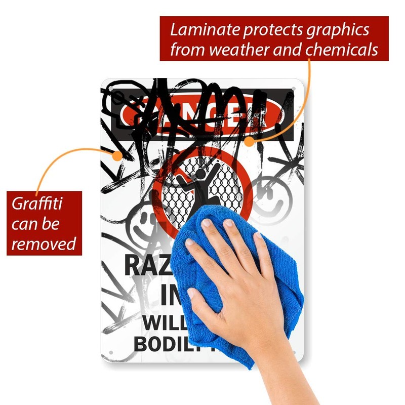 - LAMINATED. Graphics are protected from weather and abuse. Graffiti can be cleaned off. Laminated signs outlast competitive unlaminated or overcoated signs.