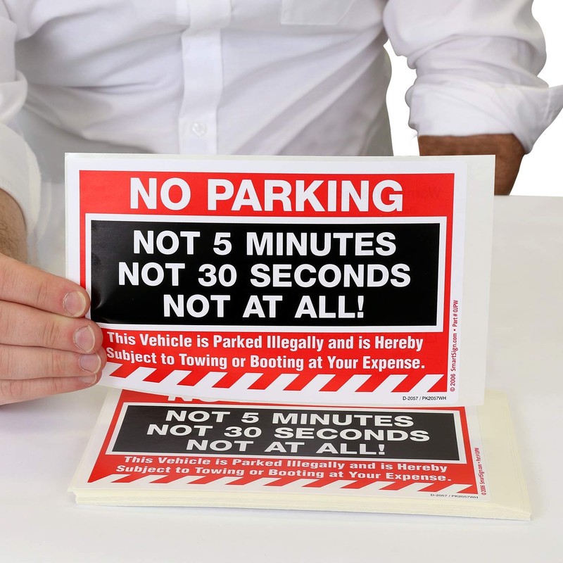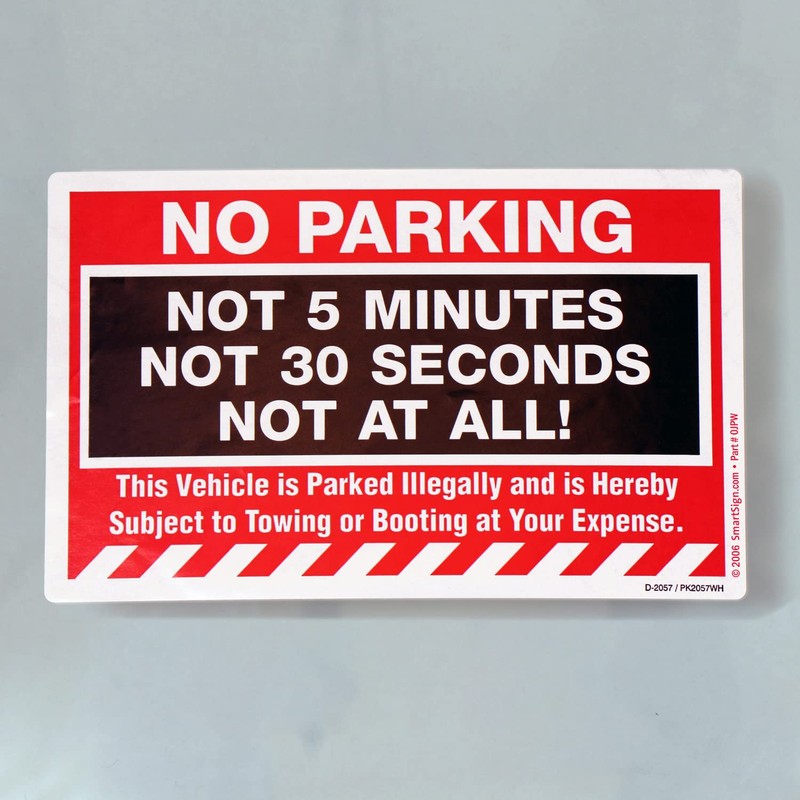 - NO PARKING. Convey your No Parking - Not 5 Minutes, Not 30 Seconds, Not At All warning with this sign.