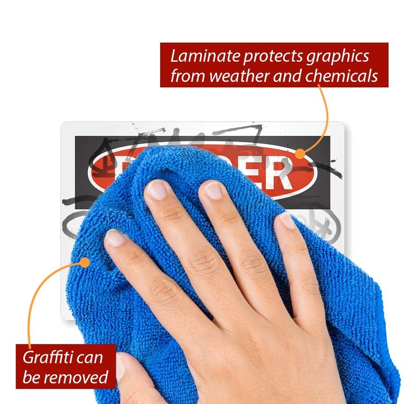 - LAMINATED PROTECTION: UV-resistant, weatherproof overlaminate protects the label from moisture, solvents, chemicals, abrasion and fading. Easily wipe off graffiti, dirt, dust, or grease.