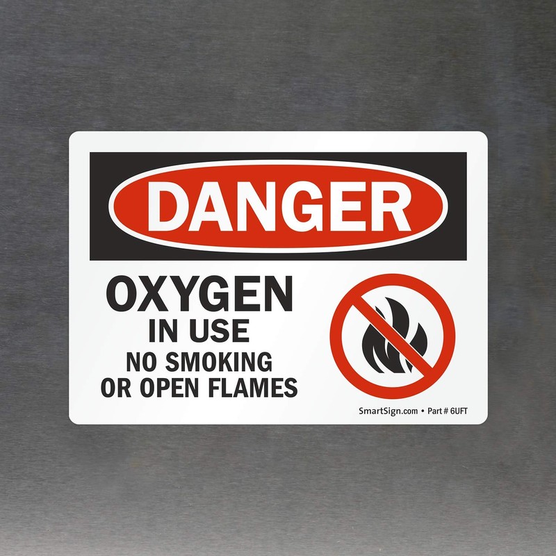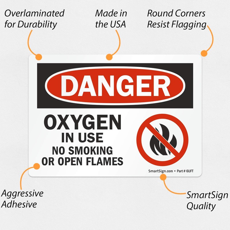 - DURABLE POLYESTER: 'Oxygen In Use No Smoking' labels are made from 3 mil thick conformable laminated polyester that has 5-year outdoor life and aggressive adhesive backing.