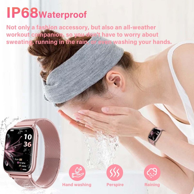 - 【IP68 Wasserdicht & Personalisierte Designs】Die intelligente Damenuhr mit IP68-Zertifizierung ist wasserdicht und staubgeschützt – perfekt für Regenwetter, Sport, Händewaschen oder Gesichtsreinigung (nicht empfohlen für heißes Duschen oder langes Unterwassertauchen). Wählen Sie aus 8 vorinstallierten Zifferblättern oder laden Sie über die App Hunderte von Designs herunter – sogar mit persönlichen Fotos. Verleihen Sie Ihrer Smartwatch für Damen täglich einen individuellen Look!