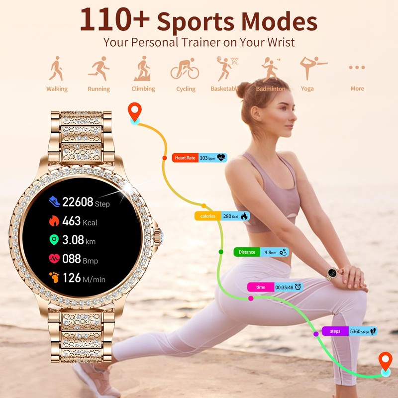 - 💟[Bling Diamond Strass Smartwatch Damen]:Exquisite Uhr mit Diamanteinlage zeigt elegantes, glänzendes und edles Temperament. Es gibt 146 glänzende Strassdiamanten in der Damen Smartwatch mit Telefonfunktion, was wirklich eine Kombination aus Sport und Mode ist.Hinweis: Smartwatch ist kompatibel mit Android 4.4/iOS6.1 und höher, tatsächliche Farbe ist rosegold